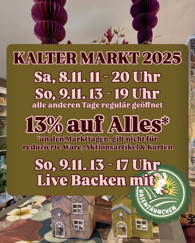 Kalter Markt 2025 Unsere Öffnungszeiten:Freitag, 7.11. 9.30 – 19 UhrSamstag, 8.11. 11 – 20 UhrSonntag, 9.11. 13 – 19 Uhr Zu unserem 130. Jubiläum Möbel Rudolf gibt es 13% auf Alles an den Markttagen, ausgenommen sind bereits reduzierte Artikel, Aktionsware und Karten. Am Sonntag, den 9.11. 13 – 17 Uhr gibt es in unserer Küchenabteilung […]